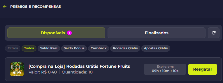 Você encontra Free Spins, Free Bets, bônus especiais, recompensas de minigames, itens de promoções, conquistas e muito mais em um único painel.