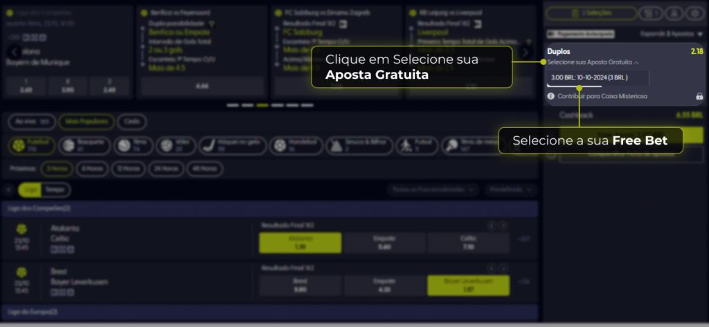 Finalize sua aposta clicando em “Fazer Aposta”. Sua aposta será feita com a Free Bet, sem utilizar seu saldo.